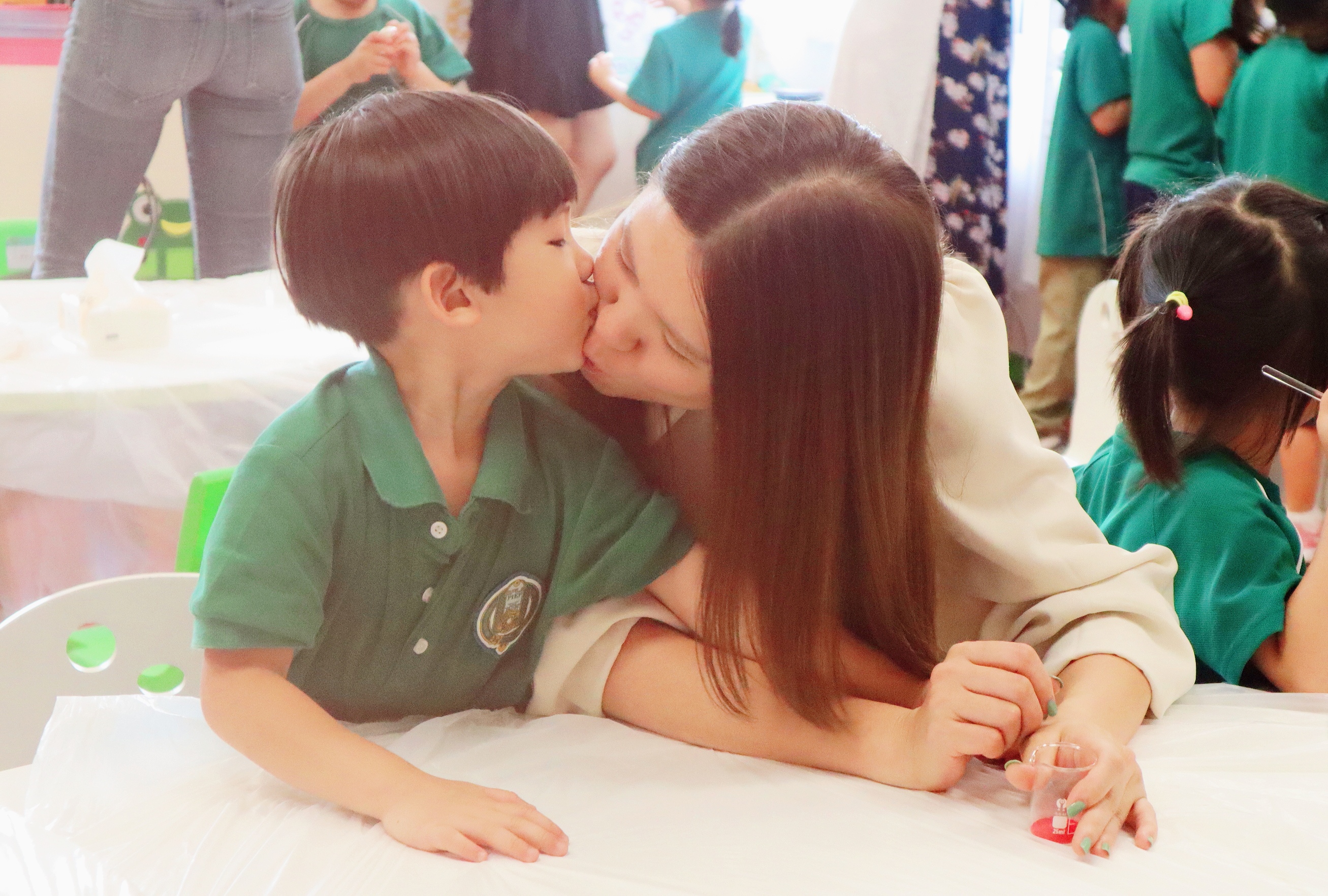 深受震撼的孩子们不由自主地亲亲妈妈、抱抱妈妈,给妈妈送水、对妈妈深情告白......,都是孩子们感谢妈妈的方式。