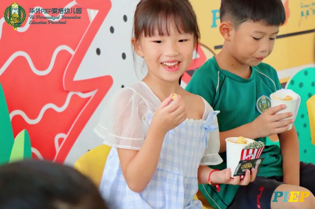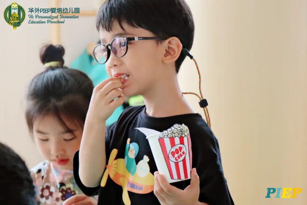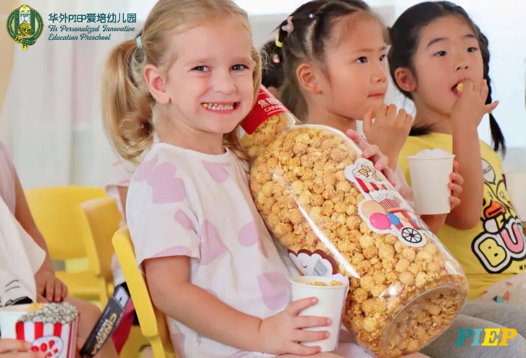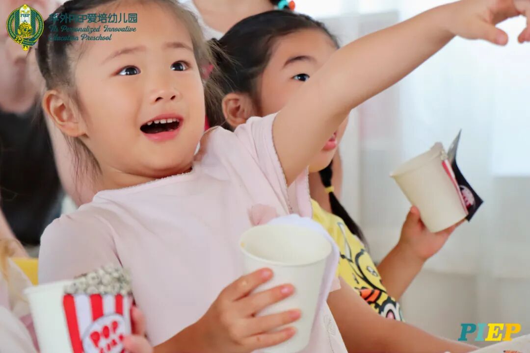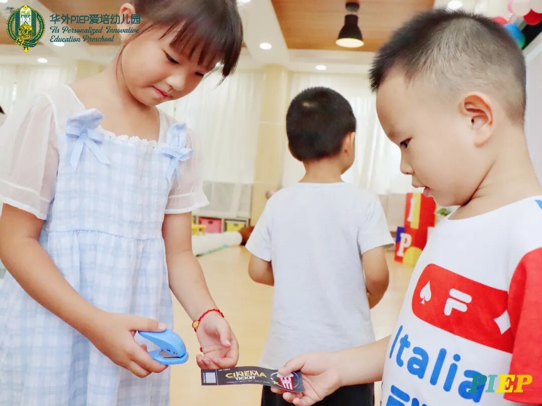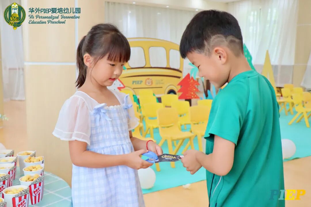 夏令营里,老师们还巧思布置了PIEP电影院。来了一场观影盛宴,孩子们就像大人一样结伴进入影院,取票,检票,购买爆米花,对号入座进行观影!宝贝们完全投入到电影情节里,时而皱眉,时而大笑,还津津有味的吃着手里的爆米花。
