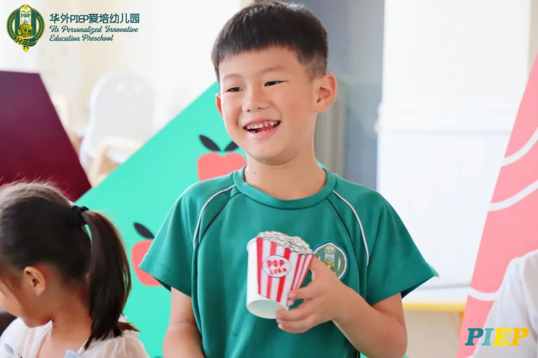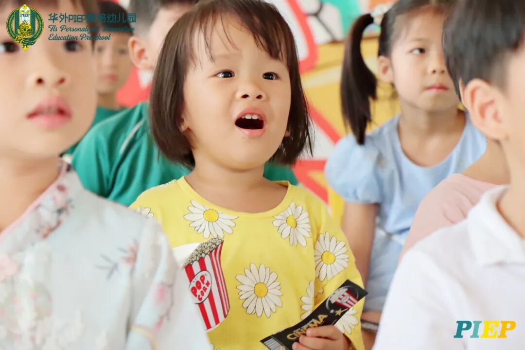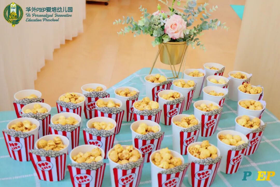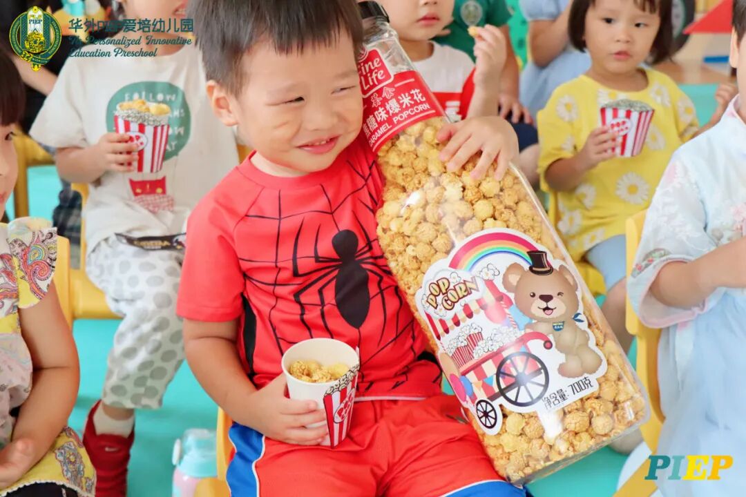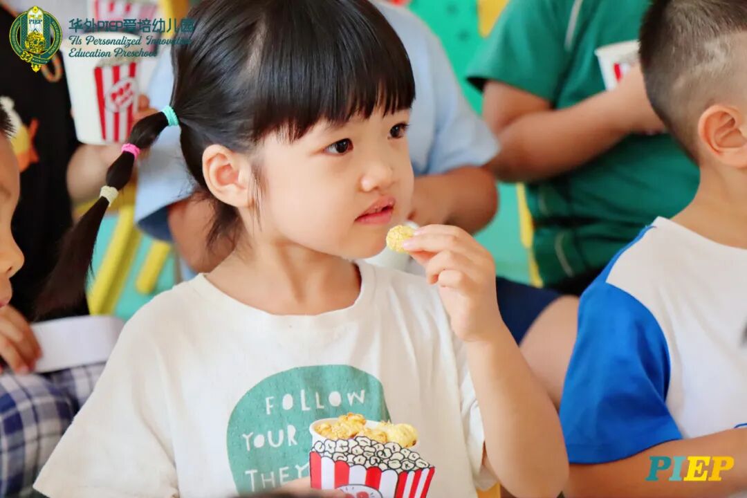 夏令营里,老师们还巧思布置了PIEP电影院。来了一场观影盛宴,孩子们就像大人一样结伴进入影院,取票,检票,购买爆米花,对号入座进行观影!宝贝们完全投入到电影情节里,时而皱眉,时而大笑,还津津有味的吃着手里的爆米花。