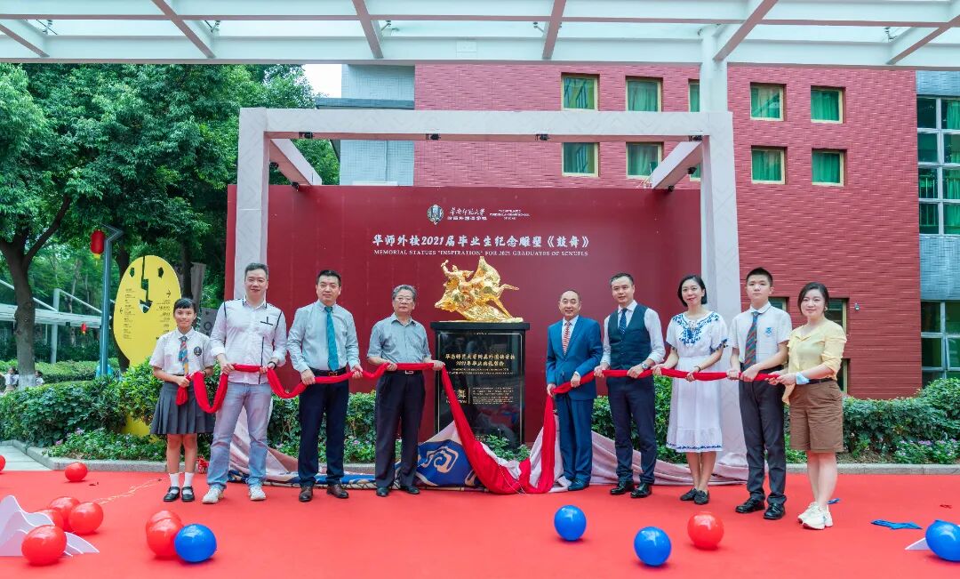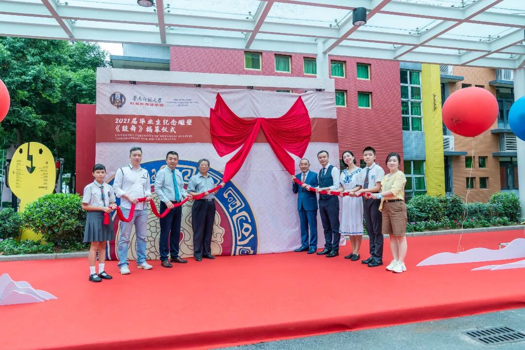由许钦松老师、杨帆执行总裁、任怀柱校长、范亚娟校长、费安兴副校长、华师外校2021年毕业生代表郑浩、高一函,以及毕业生家长代表郑浩妈妈史小娟女士、何柏希爸爸何英琪先生,一起为《鼓舞》雕塑进行揭牌仪式。