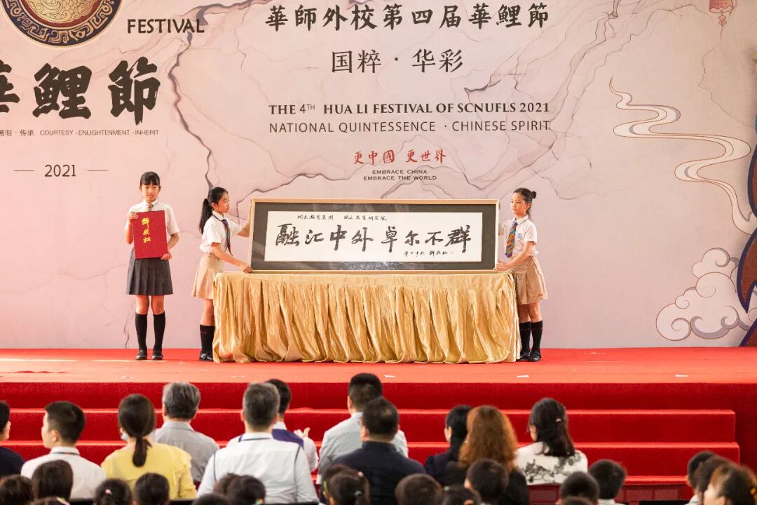 在我们华鲤节的现场展示了由国家一级美术师许钦松先生亲笔书写华师外校校训——“融汇中外 卓尔不群”。书法浑然天成,刚劲有力,它激励我们以“更中国,更世界”的办学特色培育更优秀的人才而努力。许钦松先生还将著作《吞吐大荒—许钦松山水画集》赠予华师外校,意图共同推进当代中国山水画艺术以及美育教育的发展。