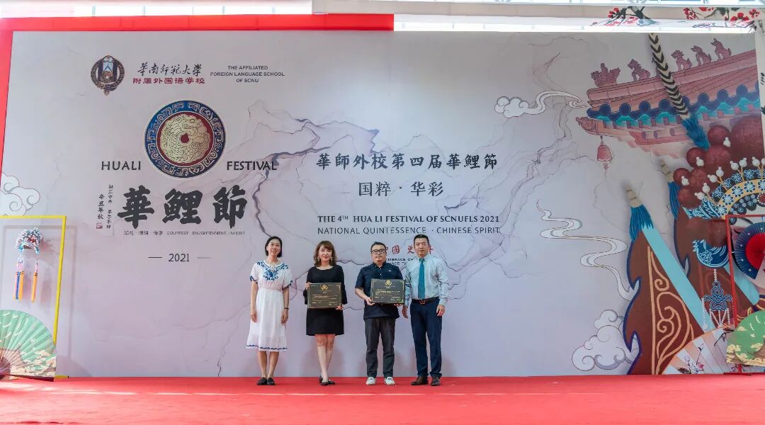 ◆华师外校创新融合部范亚娟校长,CEP中学部费安兴副校长为陶陶居代表赵永菁女士、立白集团代表许宁先生授牌